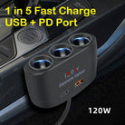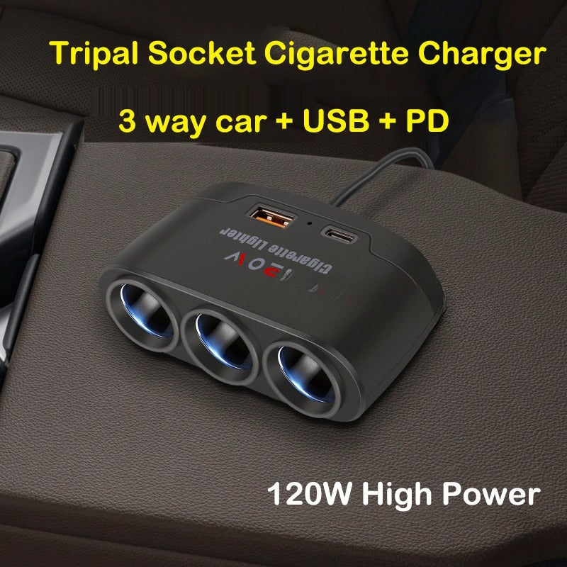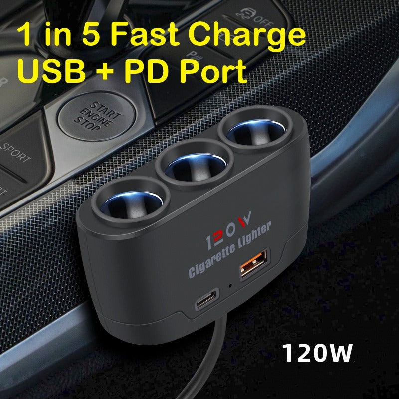 Multi-function 120W Car Fast Charger Splitter 3 Ports Integrated 2 High-end USB+PD 12v/24v Universal