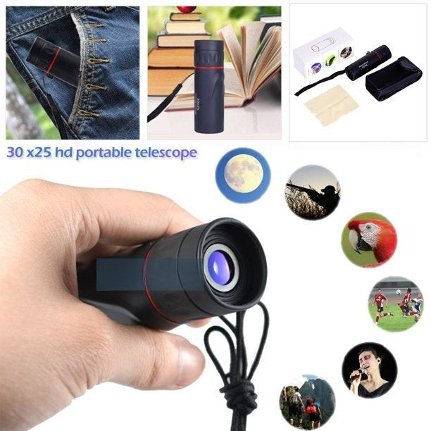 description:our HD monocular optical telescope is suitable for enjoying the beautiful nature, bird watching, sports watching etc. Night vision day. it will help you to see things in low light conditions, this does not help you see things in the dark. can not be used overnight. powerful, ultra-compact and ultra-light to carry. you are worth it.features:1. This monocular offers a 7X magnification and a 25mm objective diameter.2. The fully coated optical, meanwhile, ensure superior light transmission and brightness.3. Single hand operation, compact and lightweight, with wrist strap that is easy to carry.4. Night vision. it will help you to see things in low light conditions, this does not help you see things in the dark.5. Good for sporting events, concerts, bird watching, camping, fishing, golf, scope and traveling.Product parameters:Model: 30x25Material: rubber shockproofColour: BlackEyepiece: 15 mmObjective lens: 25 mmMagnification: 7xCoating: Objective FMC Green Film Eyepiece FMC Blue FilmField of view: 1000 m / 7000 mSize: 9.3X3X3cmpacking list:Telescope*1Cloth bag*1Wipe cloth*1#Firstscope Telescope#Automatic Telescope#Explorer Telescope Kit#Dobsonian Telescope#Copper Telescope#Gps Telescope#All Industrial#Telescope Accessories#