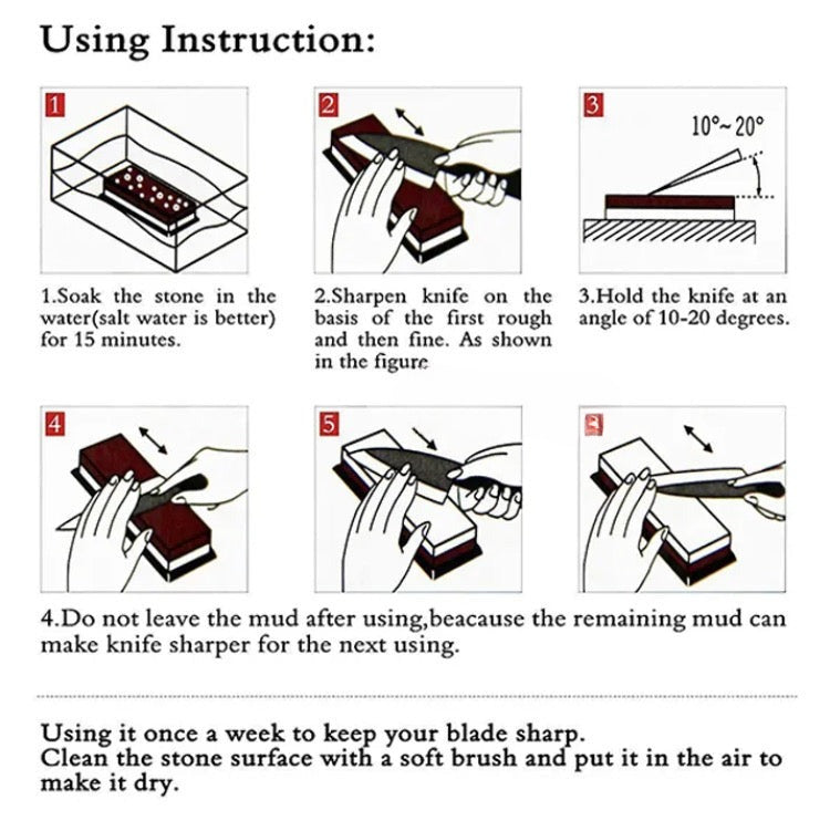- 1.Soak the stone in the water for 5-15 minutes, and then put it on a steady platform. Sharpening the kniveswith one or two steps is decided by the degree of blunt tool.
